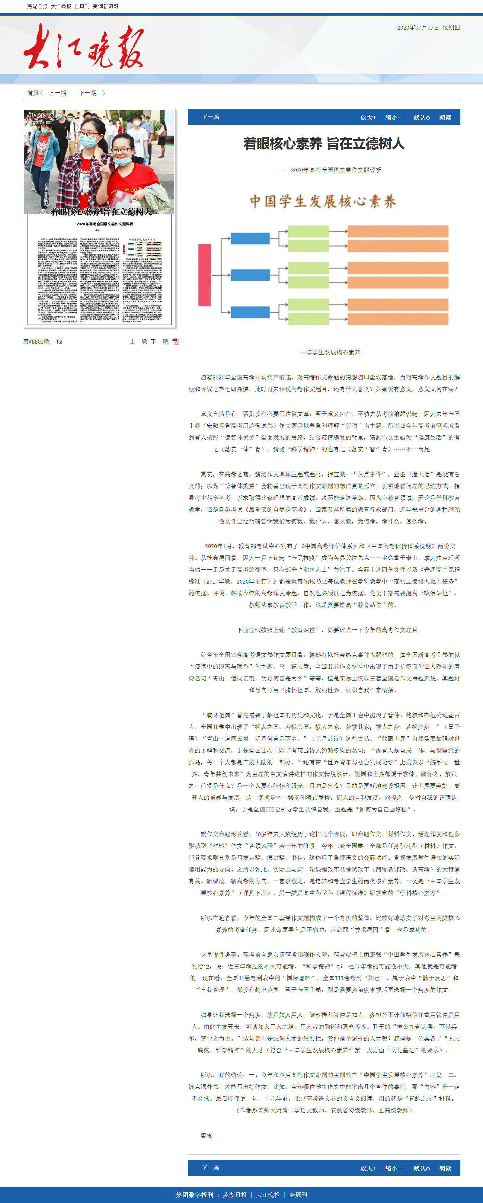 2020年1月,教育部考试中心发布了《中国高考评价体系》和《中国高考评价体系说明》两份文件。从社会层面看,因为一月下旬起“全民抗疫”成为各界关注焦点——生命重于泰山,成为焦点理所当然——于是关于高考的变革,只有部分“业内人士”关注了。实际上这两份文件以及《普通高中课程标准(2017年版,2020年修订)》都是教育领域乃至每位教师在学科教学中“落实立德树人根本任务”的依据。评说、解读今年的高考作文命题,自然也必须以之为依据。党员干部需要提高“政治站位”,教师从事教育教学工作,也是需要提高“教育站位”的。