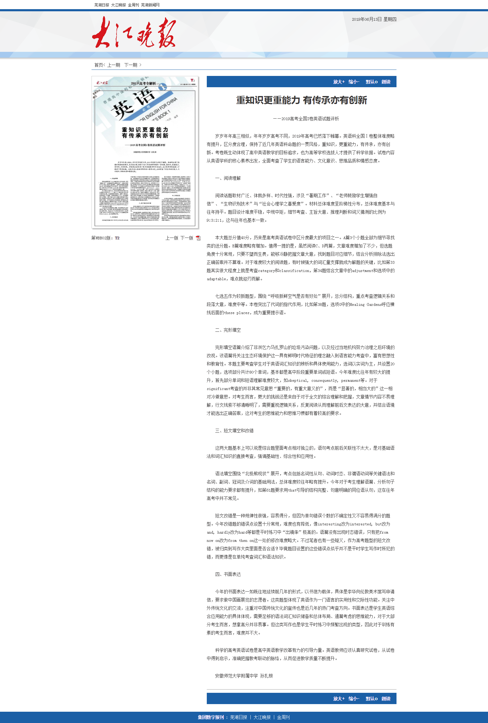 科学的高考英语试卷是高中英语教学改革有力的引导力量。英语教师应该认真研究试卷,从试卷中得到启示,准确把握教考联动的脉络,从而促进教学质量不断提升。