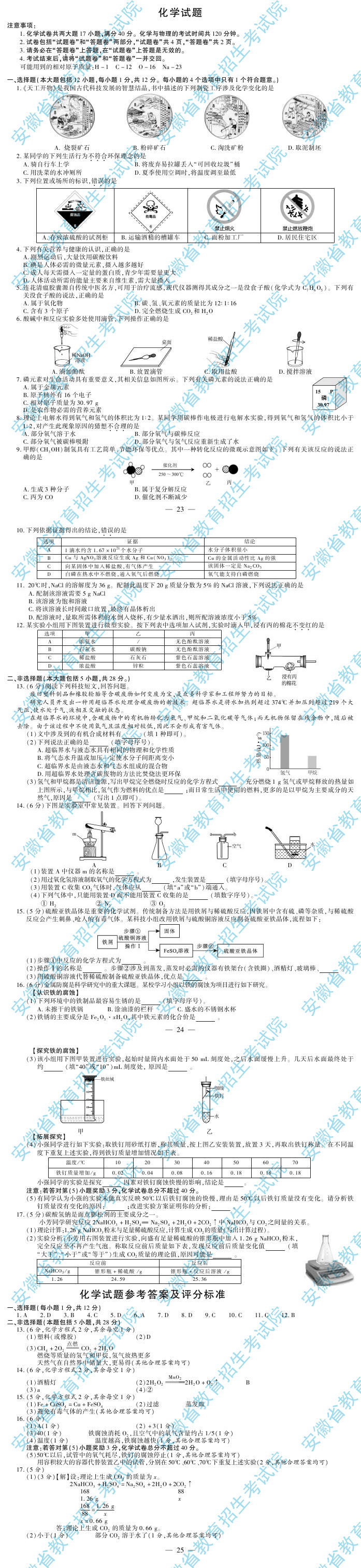 2020年安徽省初中学业水平考试化学试题参考答案及评分标准