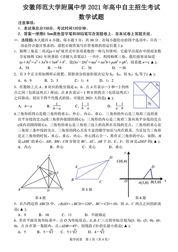 安徽师范大学附属中学2021年高中自主招生考试数学试题、答题卷、参考答案