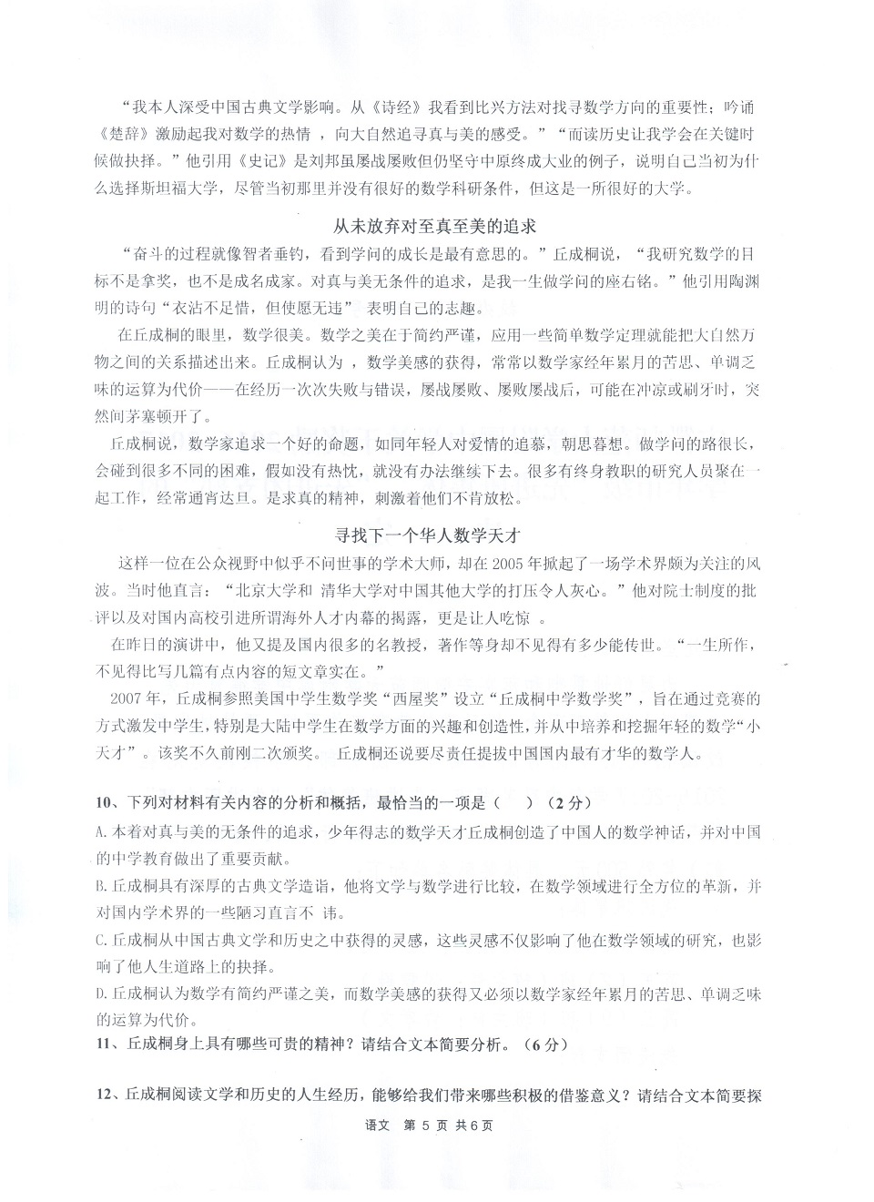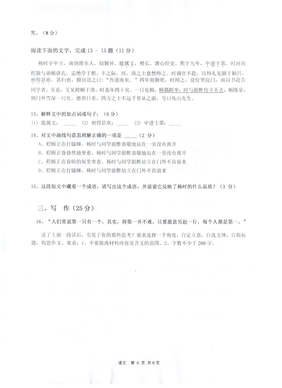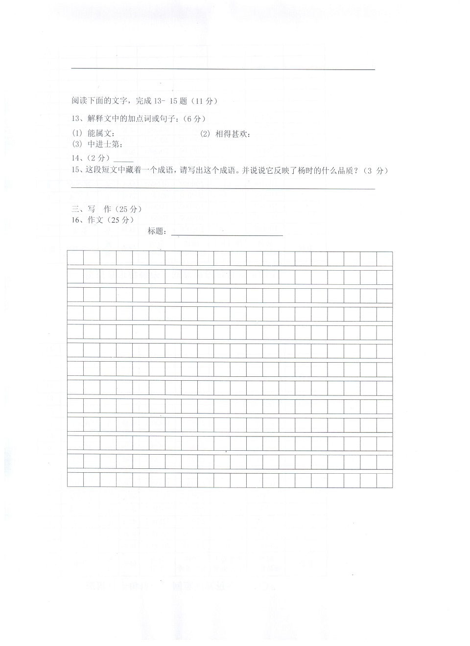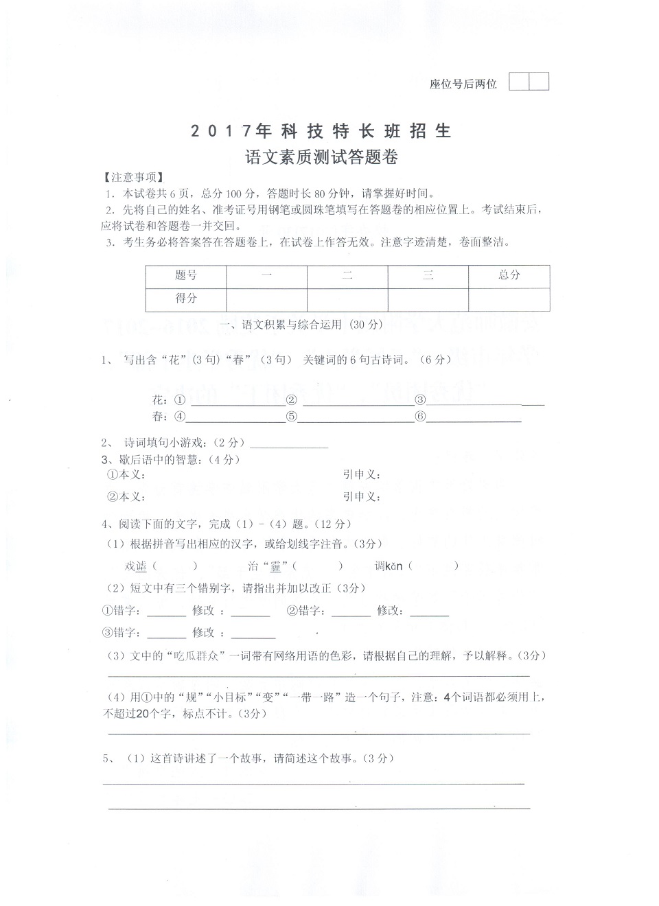 安徽师范大学附属中学2017年自主招生考试语文试题、答题卡、参考答案