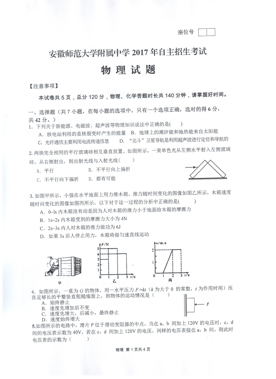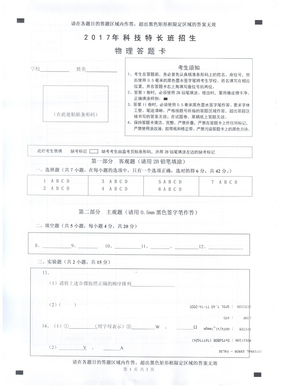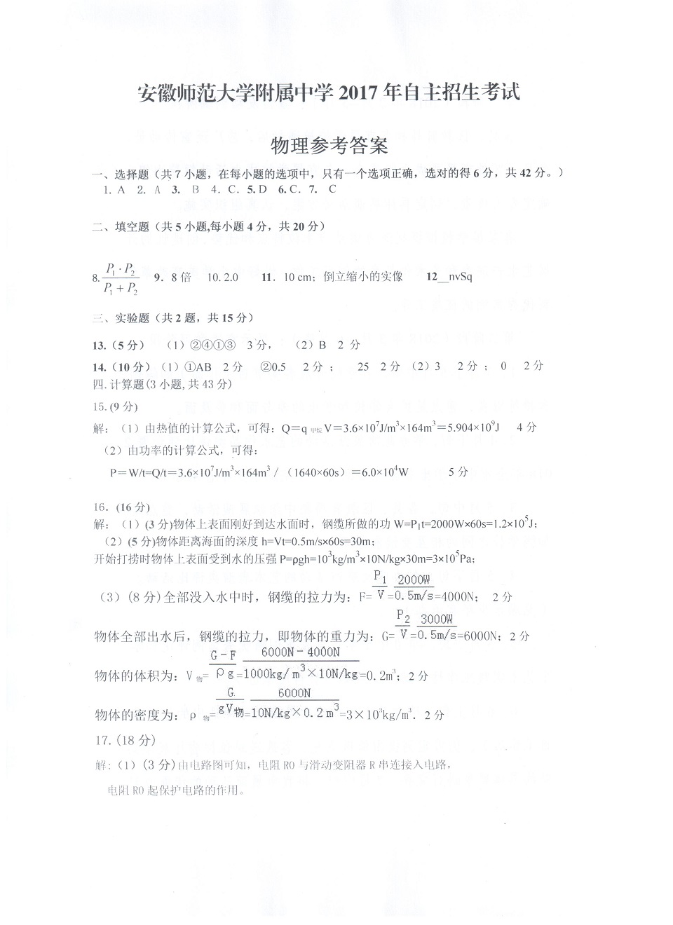 安徽师范大学附属中学2017年自主招生考试物理试题、答题卡、参考答案