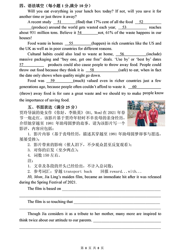 安徽师范大学附属中学2021年高中自主招生考试英语试题、答题卷、参考答案
