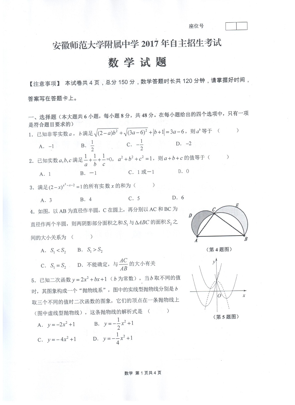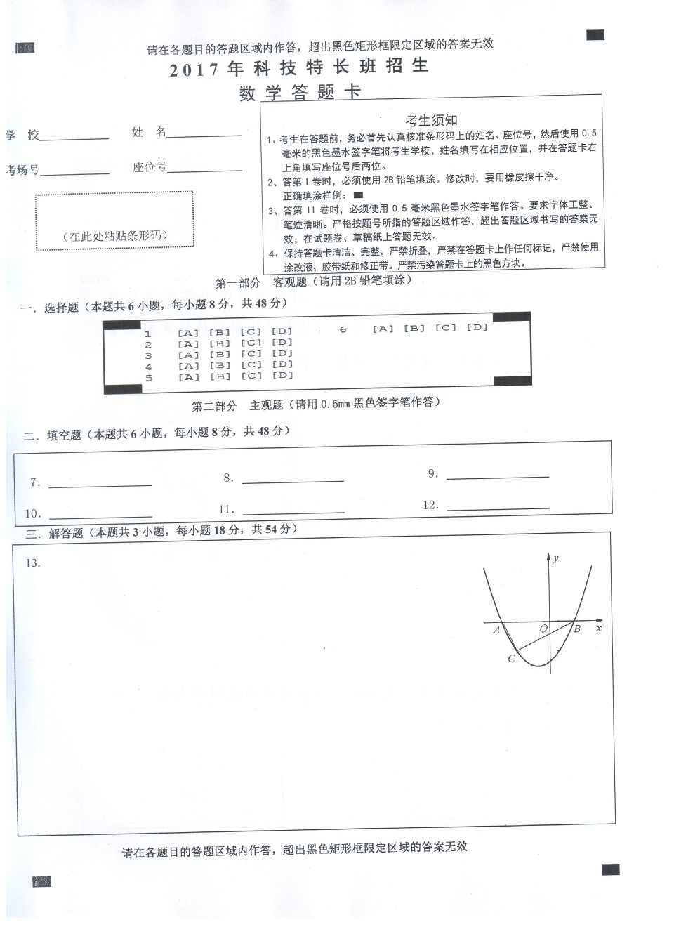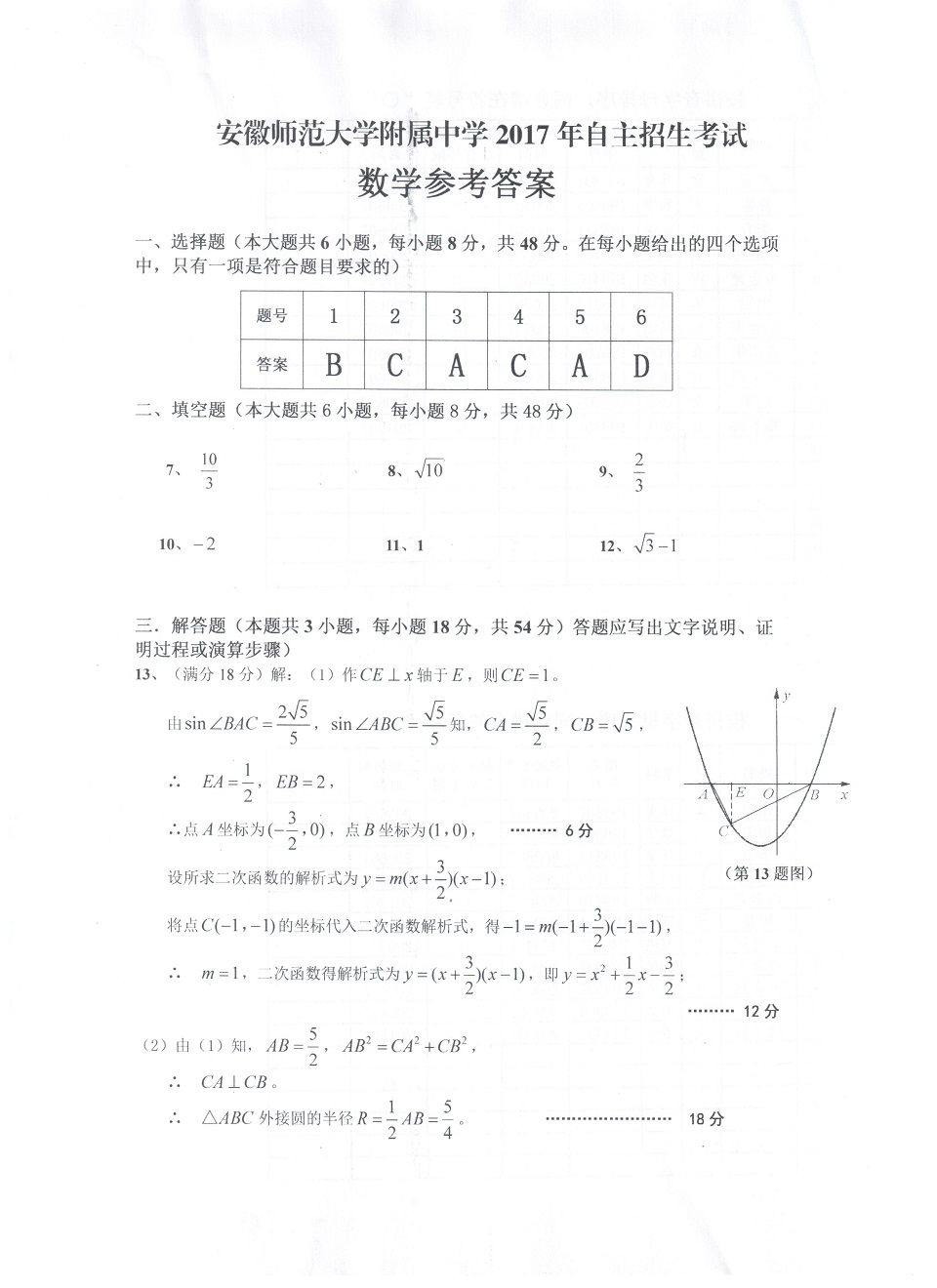 安徽师范大学附属中学2017年自主招生考试数学试题、答题卡、参考答案