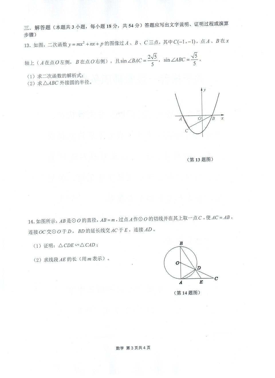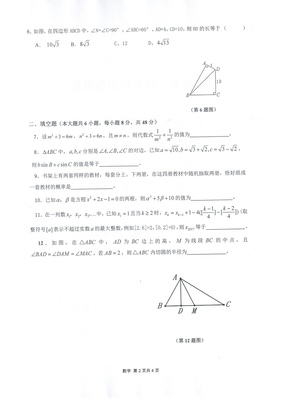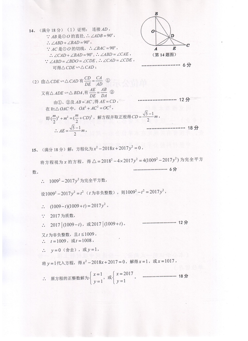 安徽师范大学附属中学2017年自主招生考试数学试题、答题卡、参考答案