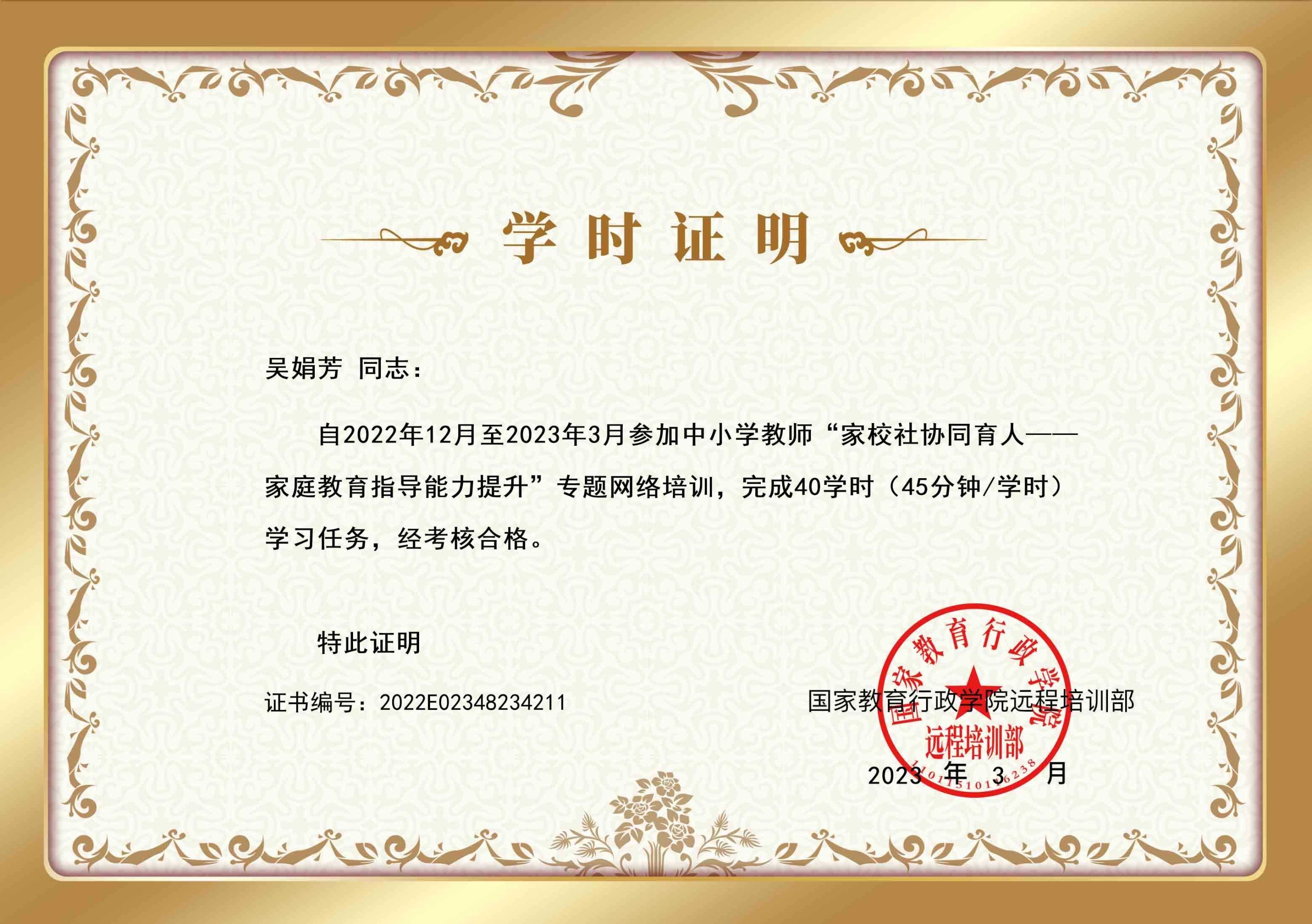本网讯(德育处 侯远军)2022年12月13日至2023年3月13日,芜湖市侯远军名班主任工作室研修人员参加了国家教育行政学院组织的 “家庭教育指导能力提升”专题网络培训,研修成员全部通过了考核,按时完成了培训任务。