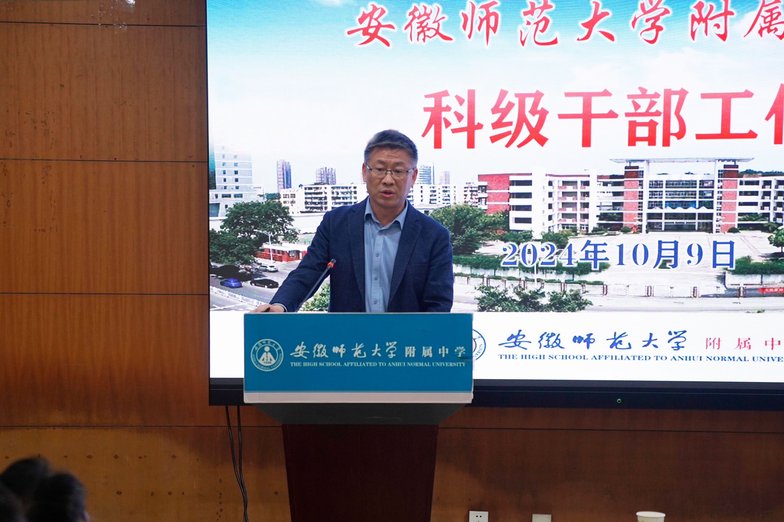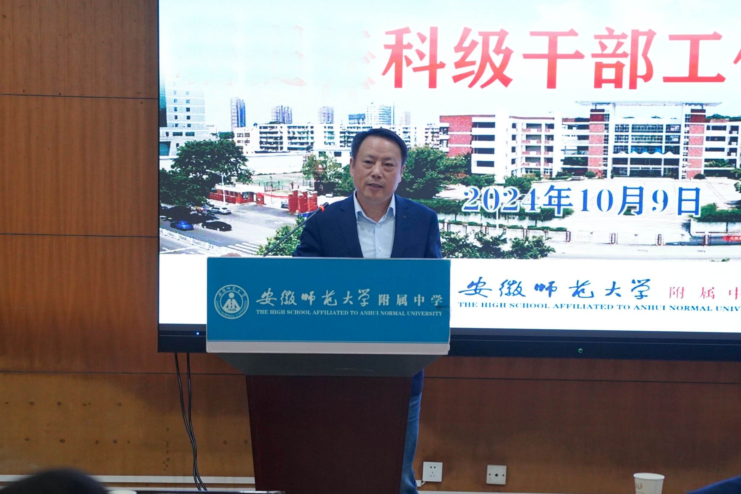 本网讯(附中 李居旖)道相同者谋则远,心相通者行则达。为进一步加强学校科级干部队伍建设,提升中层行政管理人员的管理能力,10月9日,安徽师范大学附属中学(下称附中)在竟成楼六楼会议室召开科级干部工作汇报会,学校领导班子成员、科级干部参加会议,会议由副校长白凌志主持。