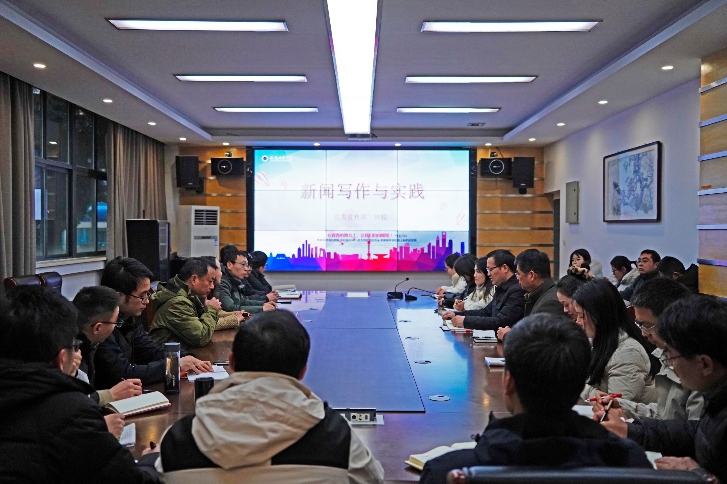 本网讯(附中 李居旖)为进一步提升学校新闻稿件撰写水平,助推学校新闻宣传工作再上新台阶,12月23日,安徽师范大学附属中学在育英楼第五会议室举办新闻采写技能培训会。此次培训会邀请了安徽师范大学党委宣传部副部长田超作专题培训,附中党委书记夏吉中、副校长白凌志、校长助理翟佳及各处室主任、各教研组、支部、年级新闻采写员参加本次培训。培训会由校办副主任侯远军主持。