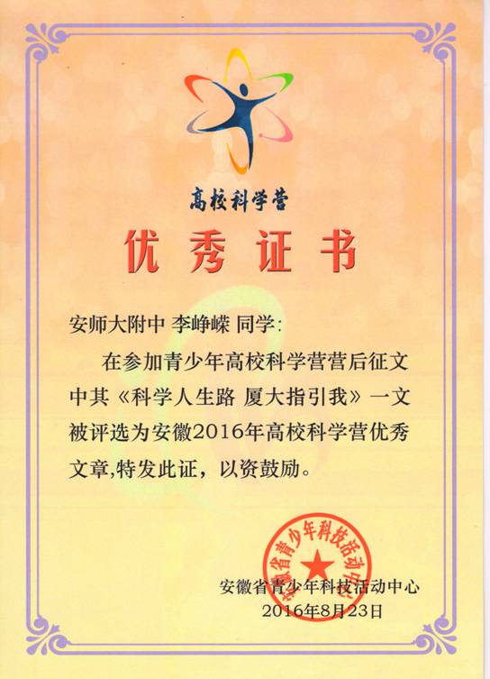 本网讯(物理组 卢先立)从刚刚结束的安徽省2016年青少年高校科学营工作总结会议上获悉,我校有三位同学在青少年高校科学营营后征文省级评选中获优秀文章奖,获奖征文分别是鲁星雨同学的《凤凰花开的七月》(点击阅读全文)、李峥嵘同学的《科学人生路 厦大指引我》(点击阅读全文)、田笛同学的《谁的青春在飞》(点击阅读全文)。