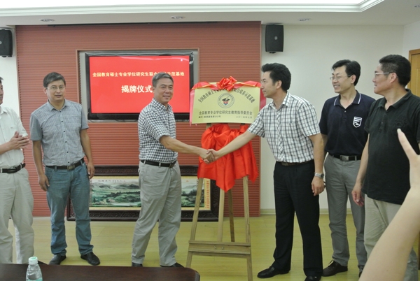 本网讯(办公室 翟佳/文 喻磊/图)8月7日上午,由全国教育专业学位研究生教育指导委员会颁发的“全国教育硕士专业学位研究生联合培养示范基地”揭牌仪式,在附中竟成新楼四楼会议室隆重举行,安徽师范大学副校长朱家存、研究生院副院长商永嘉、教科院副院长桑青松、数计学院副院长殷晓斌、外国语学院副院长张德让、研究生院招办主任付勇、研究生院学位办主任高媛媛和附属中学校长马林、副校长张祥云及教务处、德育处相关负责人出席揭牌仪式。