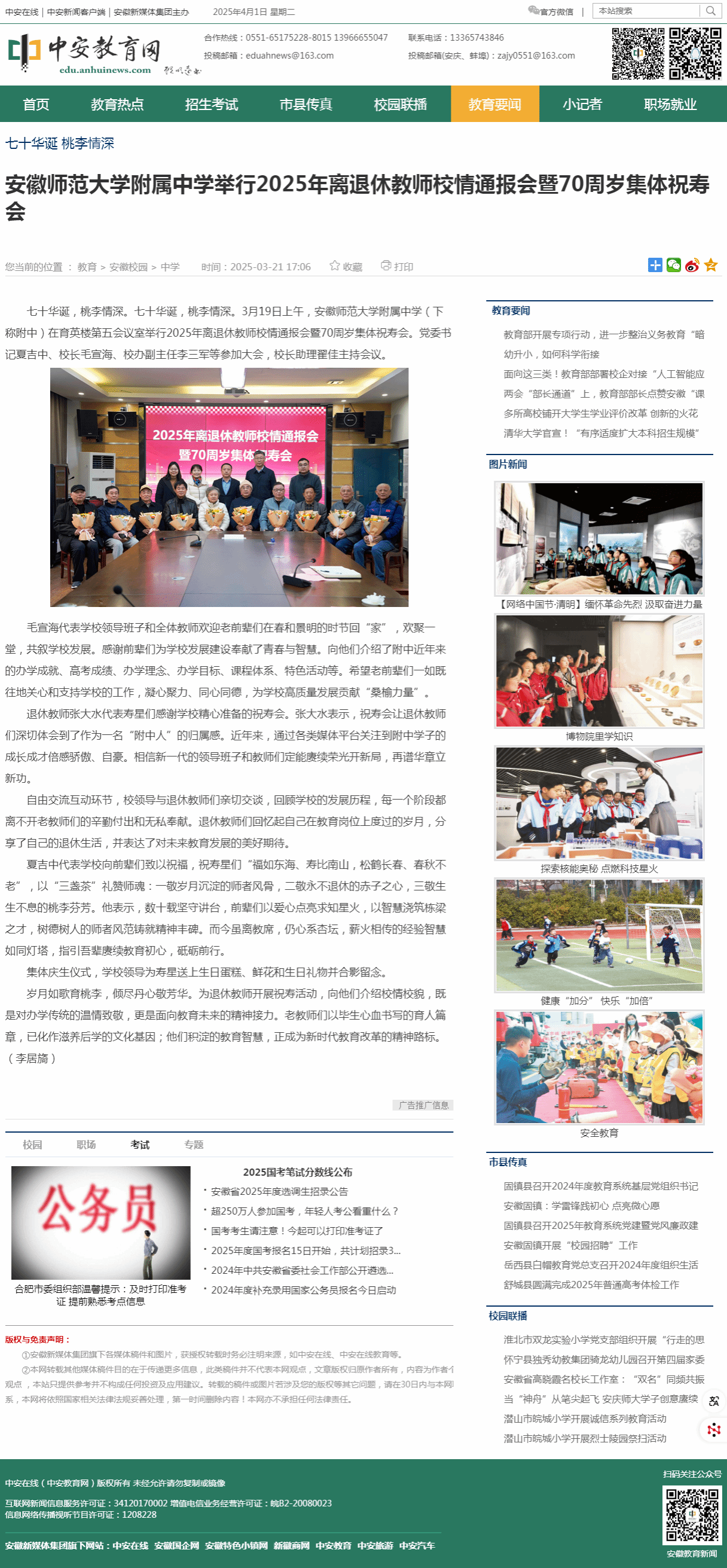 七十华诞,桃李情深。七十华诞,桃李情深。3月19日上午,安徽师范大学附属中学(下称附中)在育英楼第五会议室举行2025年离退休教师校情通报会暨70周岁集体祝寿会。党委书记夏吉中、校长毛宣海、校办副主任李三军等参加大会,校长助理翟佳主持会议。
