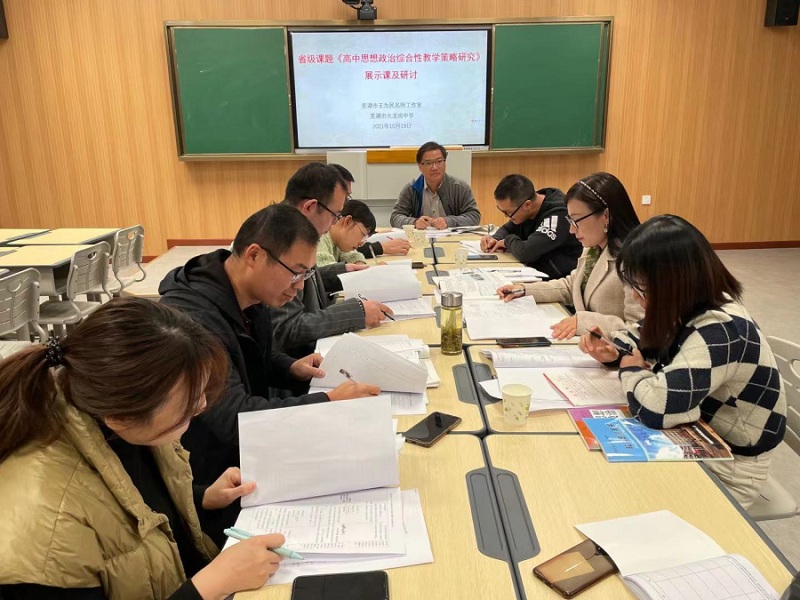 本网讯(政治组 王为民)秋高气爽,最是橙黄橘绿时,也是逐梦教研进行时。为了深入推进省级课题《高中思想政治综合性教学策略研究》研究进展及课堂教学实践应用,10月19日下午,芜湖市“王为民名师工作室”全体研修人员及课题组成员在芜湖市火龙岗中学举行了省级课题中期总结及教学展示研讨活动。
